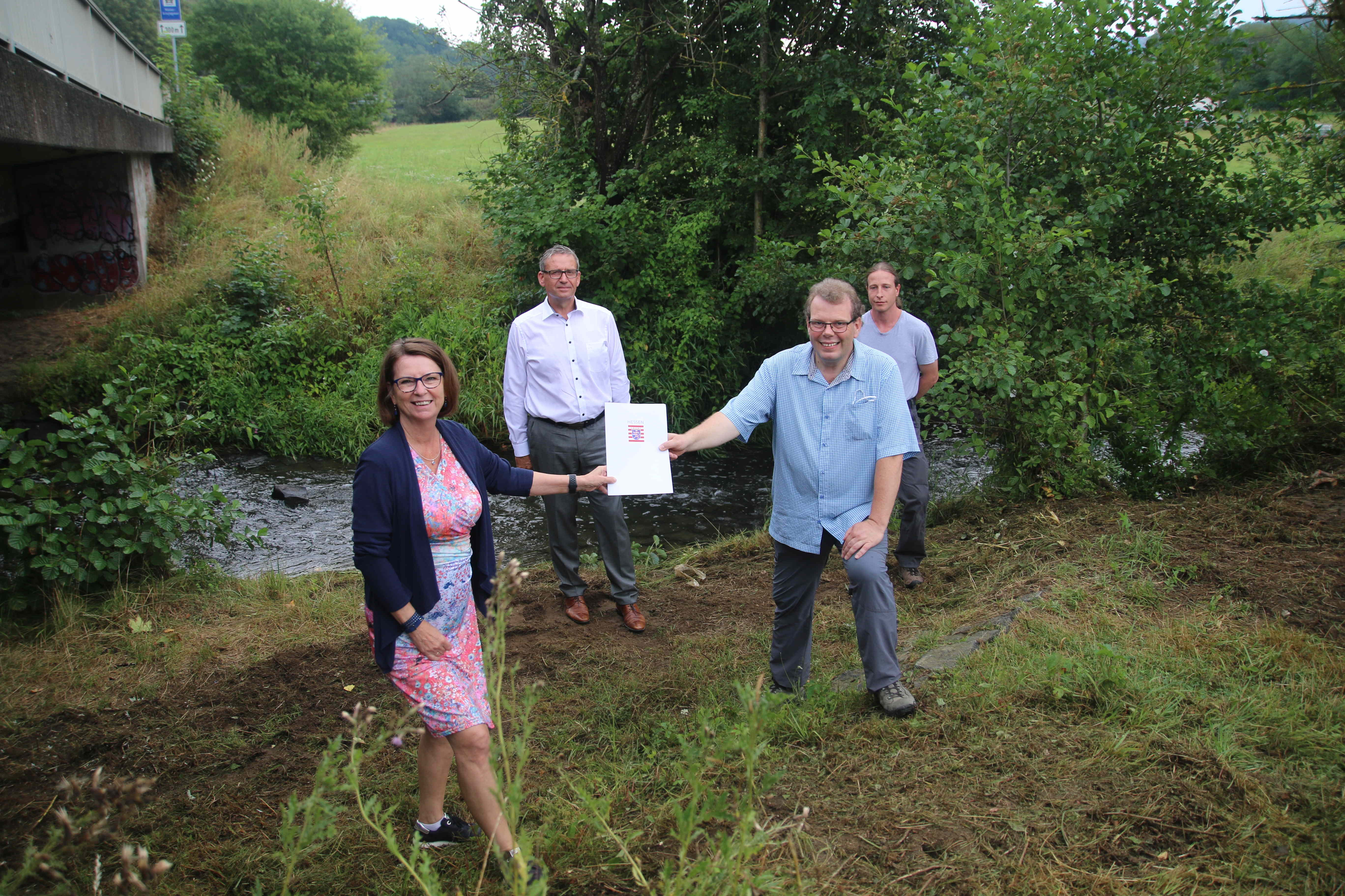 v.l.n.r.: Ministerin Priska Hinz (HMUKLV), GF Dr. Gerald Kunzelmann (HLG), Bürgermeister Götz Konrad (Gemeinde Eschenburg), Projektleiter Ingo Pfeiffer (HLG) (Foto: Frank Rademacher)