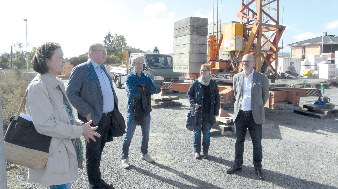 Treffen für die Zwischenbilanz auf dem neuen Baugebiet: (V.l.) Dagmar Busch (HLG), Michael Merle (Bürgermeister Stadt Butzbach), Ralph Miller (Stadt Butzbach), Annika Reichhardt (HLG), Thias Gunther (HLG) Foto: Butzbacher Zeitung