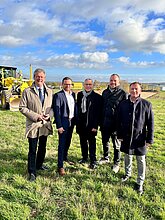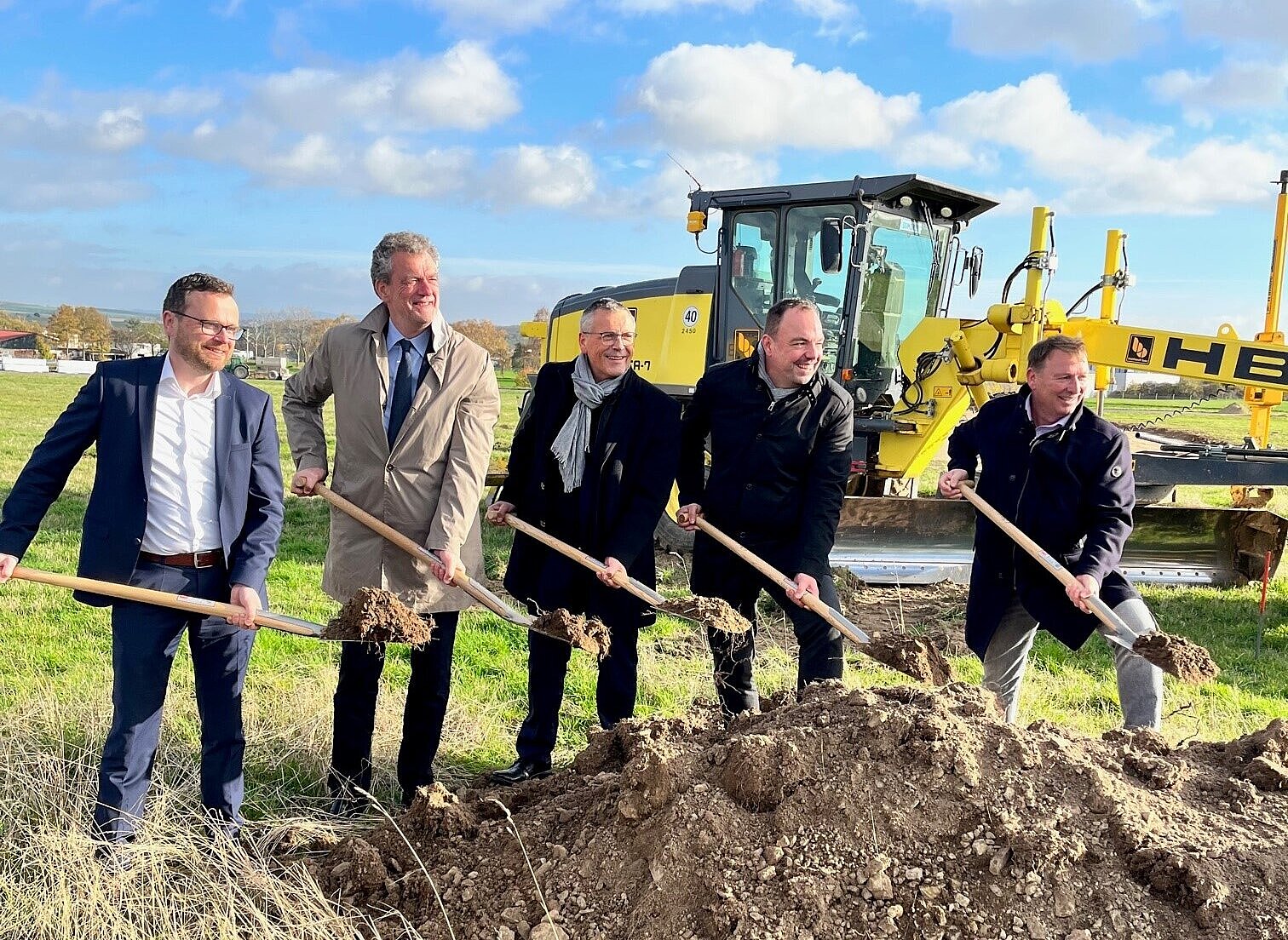 v.l.n.r. Airport-Geschäftsführer Lars Ernst, Finanzstaatssekretär Dr. Martin Worms, Landrat Andreas Siebert, Oberbürgermeister Christian Geselle und Caldens Bürgermeister Maik Mackewitz beim Spatenstich. (Foto: Peter Eschenbacher)