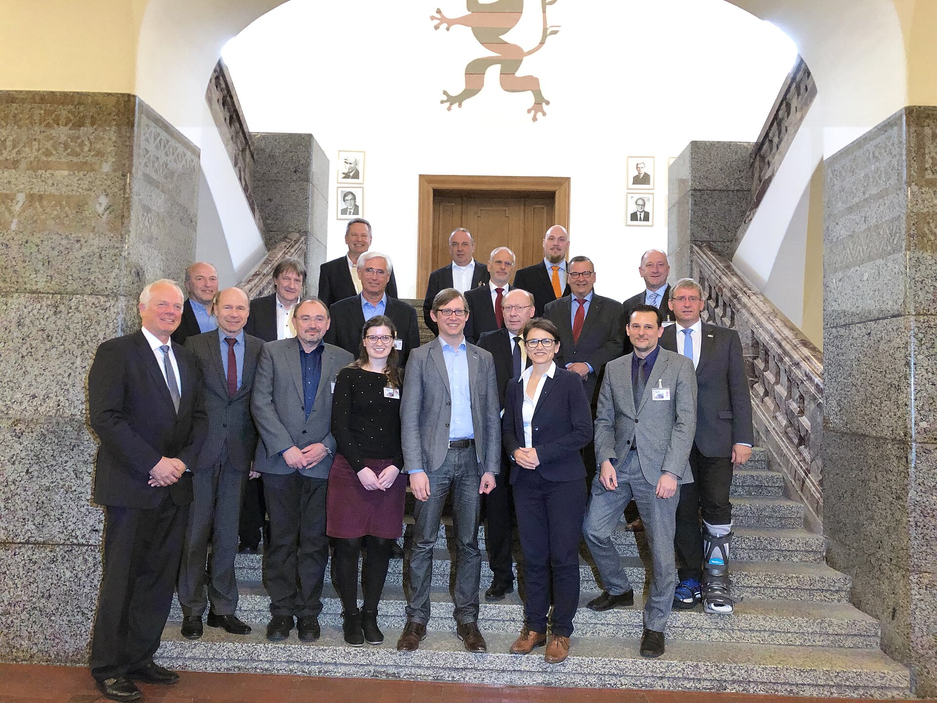 Von links oben: Dr. Andreas Meissauer (HMWEVW), Thomas Klute (Gemeinde Sinn), Olaf Burmeister-Salg (Gemeinde Münster), Joachim Heuser (Stadt Florstadt), Dr. Bernhard Hertel (Bgm. Stadt Niddatal), Joachim Pauli (Stadt Homberg/Efze), Gerald Frank (Bgm. Gemeinde Münster), Jürgen Hoffmann (Bgm. Stadt Rodgau), Markus Ebel-Waldmann (Stadtwerke Rodgau), Rüdiger Schweer (HMWEVW), Dr. Karsten McGovern (LEA), Heinz Ziegler (Stadt Homberg/Efze), Helene Pankratz (Stadt Homberg/Efze), Staatsekretär Jens Deutschendorf (HMWEVW), Axel Muhn (Bgm. Stadt Bad König), Prof. Dr. Martina Klärle (Vizepräsidentin der UAS Frankfurt), Kolja Sparrer (Stadt Bad König), Dr. Gerald Kunzelmann (Geschäftsführer HLG)