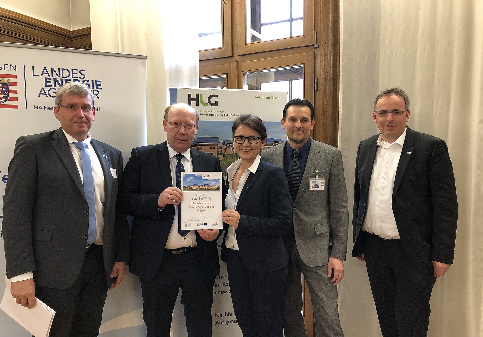 Von links: Dr. Gerald Kunzelmann (Geschäftsführer HLG), Alex Muhn (Bürgermeister Stadt Bad König), Prof. Dr. Martina Klärle (Vizepräsidentin der UAS Frankfurt), Kolja Sparrer (Stadtbaumeister Stadt Bad König), Jochen Jäger (Projektleiter HLG)
