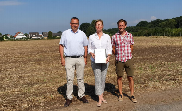 Claudia Lange, Bürgermeisterin der Gemeinde Erzhausen, hält stolz den Bewilligungsbescheid für die Förderung des Energiekonzepts in ihren Händen. Sie steht mit René Beyer und Jochen Jäger in Erzhausen vor dem Baugebiet „Die vier Morgen“. Dieses Baugebiet soll als Energie-Plus-Siedlung entwickelt werden. Die Gemeinde Erzhausen hat als erste von acht hessischen Modellkommunen den Bewilligungsbescheid für die Erarbeitung des Energiekonzeptes erhalten und übernimmt damit eine Vorreiterrolle in der Energiewende. Sie verfolgt gemeinsam mit der HLG bei der Umsetzung besonders innovative Ansätze zum Erreichen der Energiestandards. Deshalb beträgt die Förderquote für die Erstellung des Energiekonzeptes 75 Prozent, im Normalfall werden nur 50 Prozent der Kosten gefördert. Plus-Energie-Siedlungen sind Siedlungen, die mehr Energie erzeugen, als ihre Bewohner verbrauchen. Die Planung und der Bau solcher Siedlungen sind eine Pionierleistung. Bei dieser Entwicklung wird die Gemeinde Erzhausen von der HLG unterstützt.