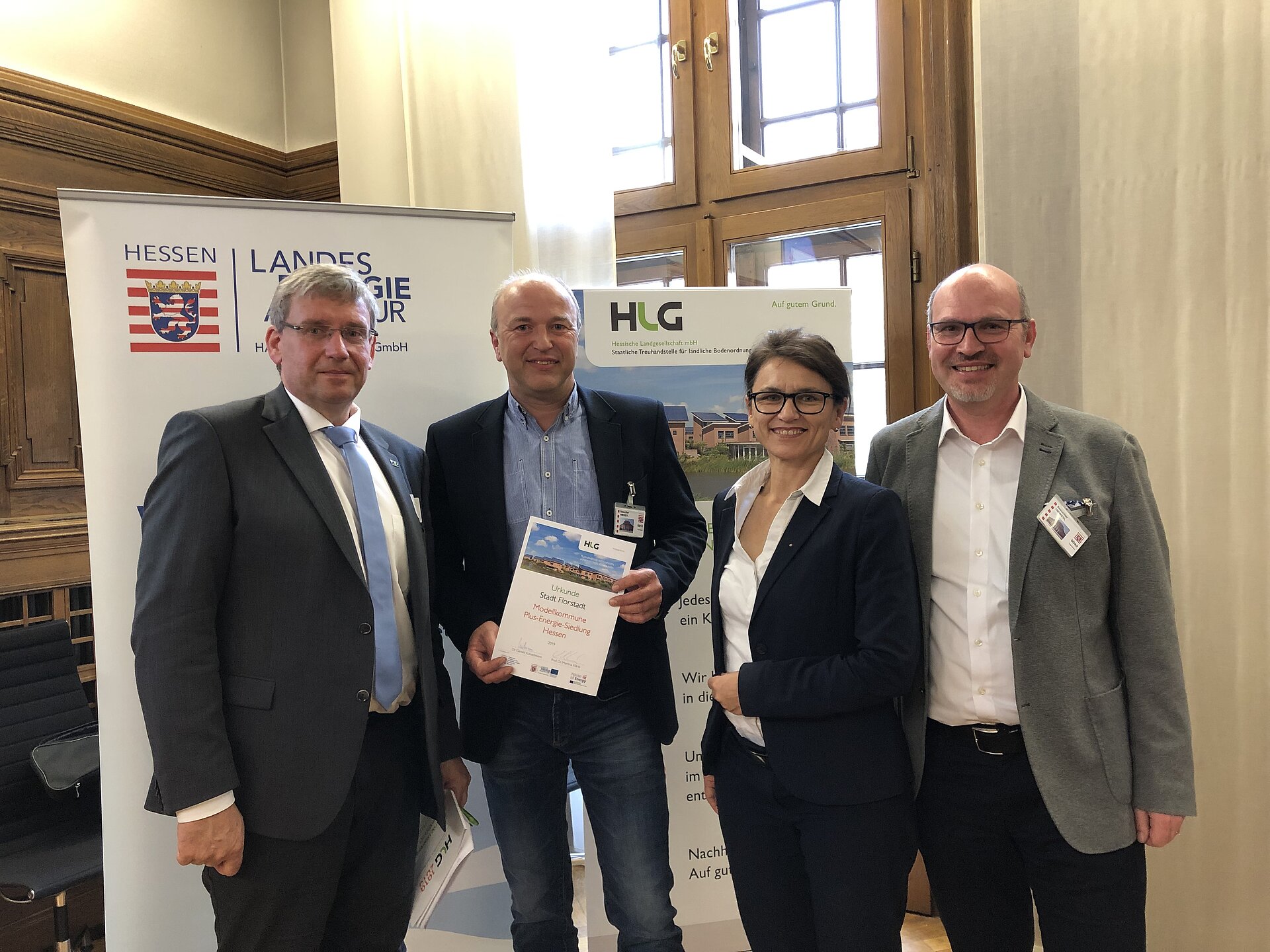Von links: Dr. Gerald Kunzelmann (Geschäftsführer HLG), Joachim Heuser (Bauamtsleiter Florstadt), Prof. Dr. Martina Klärle (Vizepräsidentin der UAS Frankfurt), Gunther Thias (HLG Fachbereichsleiter)