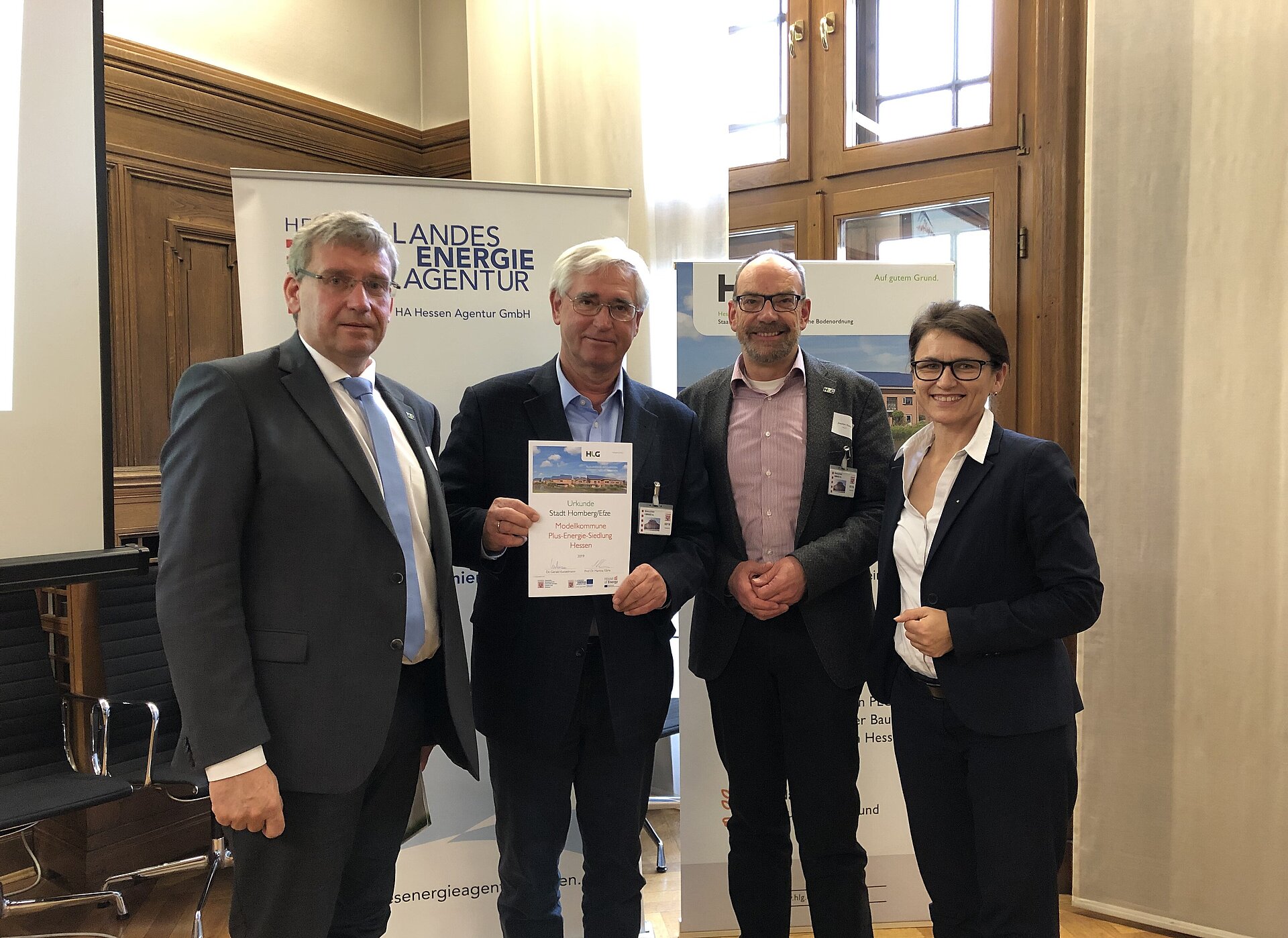 Von links: Dr. Gerald Kunzelmann (Geschäftsführer HLG), Joachim Pauli (Erster Stadtrat Kreis Homberg/Efze), Joachim Kothe (Projektleiter HLG), Prof. Dr. Martina Klärle (Vizepräsidentin der UAS Frankfurt)