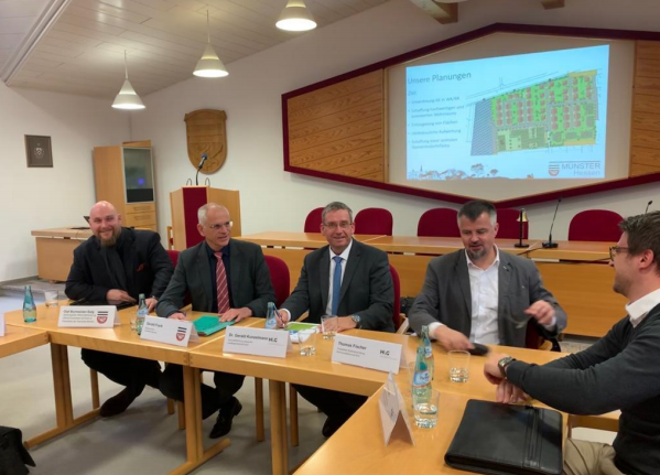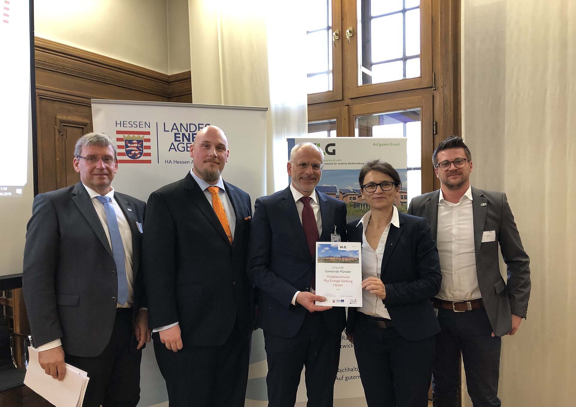 Münster. Die Gemeinde Münster ist Klimaschutzkommune und hat schon eine Passivhaussiedlung. Jetzt entwickelt die Kommune eine „Plus-Energie-Siedlung“ zusammen mit der Hessischen Landgesellschaft (HLG) und ist damit eine von acht Modellkommunen in Hessen. Auf der Plus-Energie-Veranstaltung am 26. November 2019 stellte die Gemeinde Münster mit Vertretern der LandesEnergieAgentur (LEA) und der HLG die Planung der Plus-Energie-Siedlung auf der Innenentwicklungsfläche und Gewerbebrache in Münster vor. Auf der rund 33.000 m² großen, aktuell noch voll versiegelten Fläche soll zukünftig neben Wohnbebauung auch ein seniorengerechtes Wohnen sowie eine Kindertagesstätte entstehen.