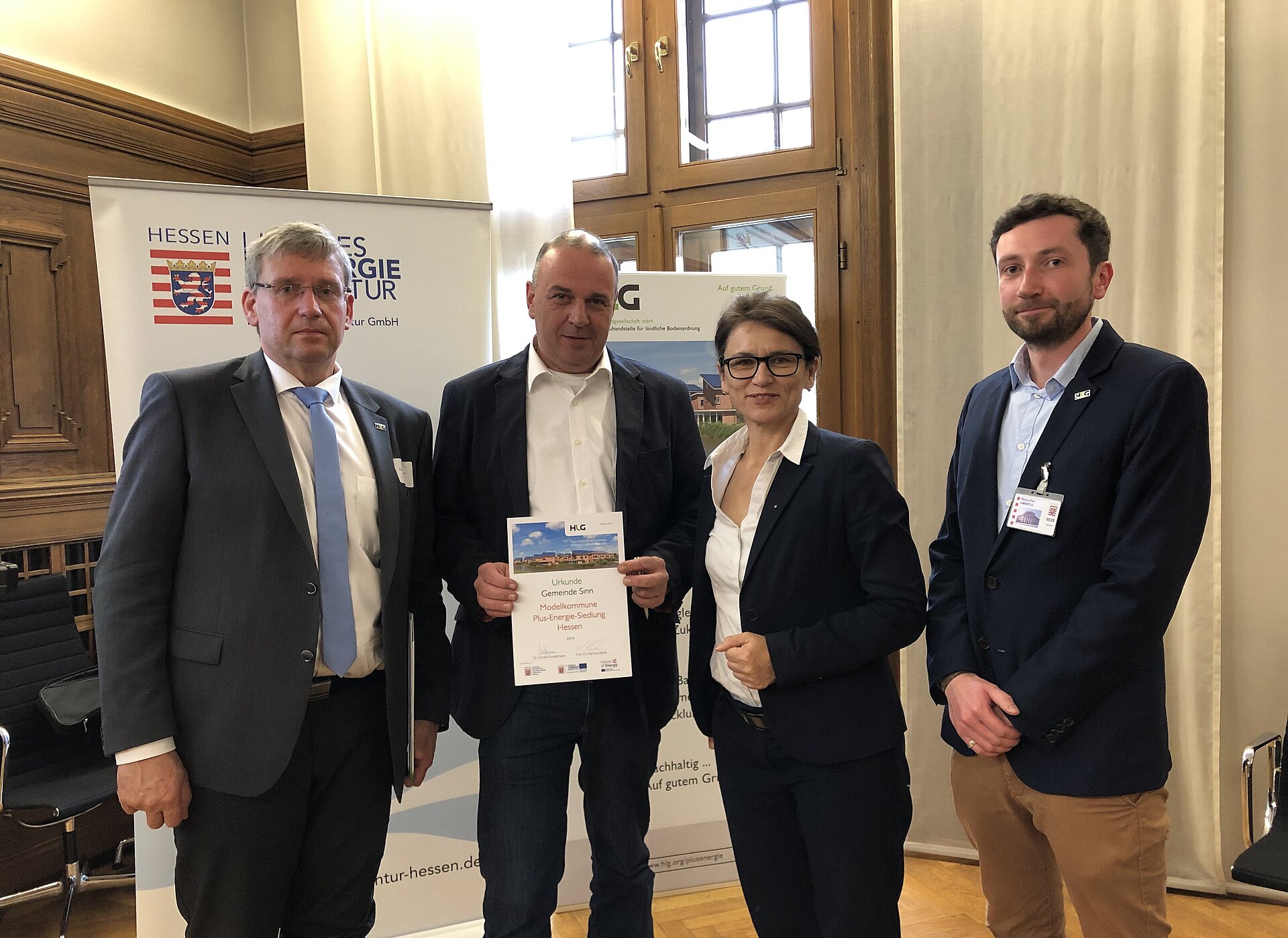 Von links: Dr. Gerald Kunzelmann (Geschäftsführer HLG), Thomas Klute (Bauen, Liegenschaften und Umwelt), Prof. Dr. Martina Klärle (Vizepräsidentin der UAS Frankfurt), Florian Beck (Projektleiter HLG)